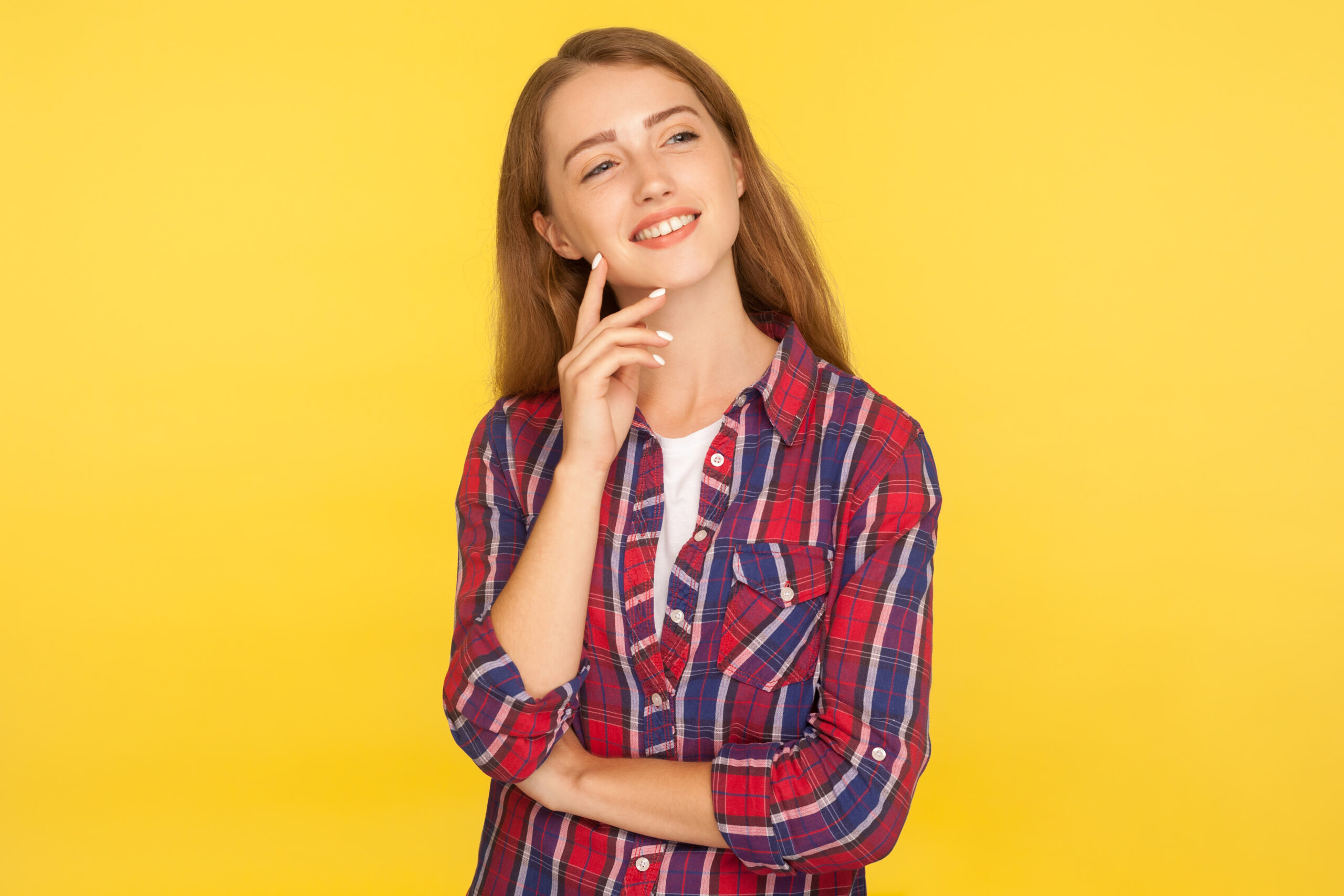 Portrait of happy dreamy ginger girl in checkered shirt looking aside with inspired expression and thinking creative idea, dreaming par Guillaume Admin | 25 Mai 2025